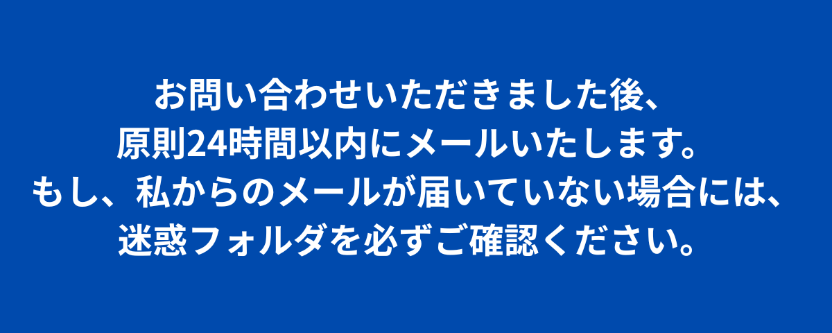 ※私から送りますメールが迷惑フォルダに入っている場合がございます。原則24時間以内にメールいたしますので、届いていない場合には、迷惑フォルダをご確認ください。