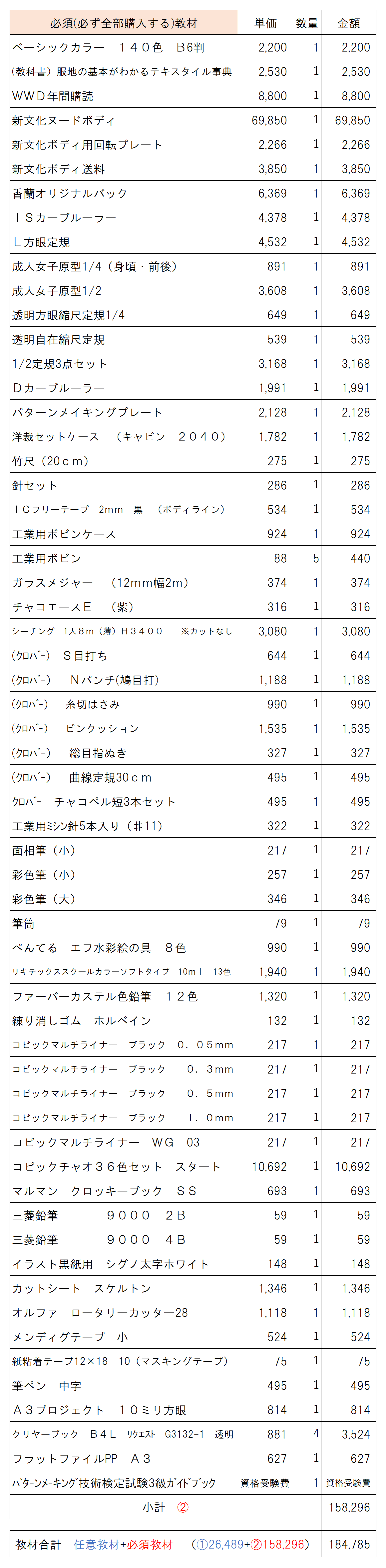 2026年度ファッションデザイン科 教材費合計