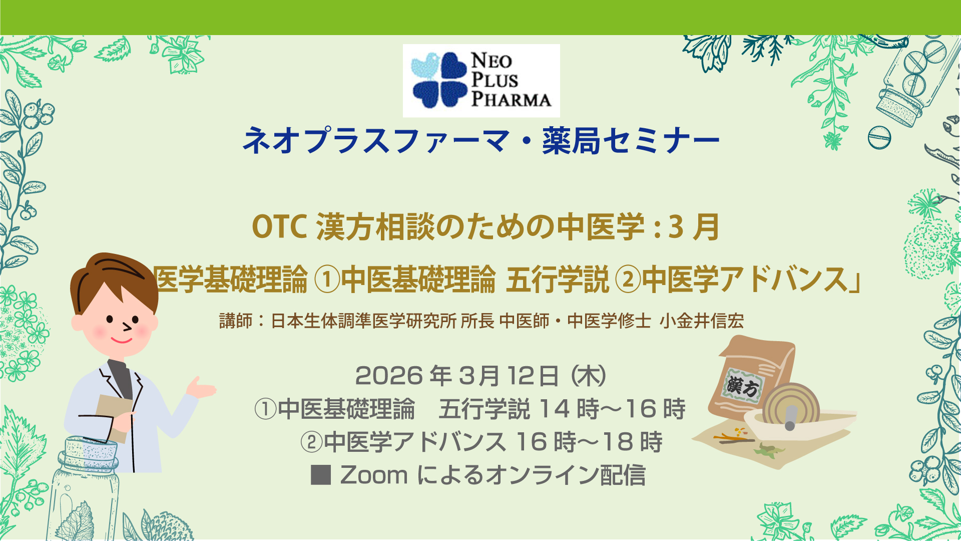 2026年3月12日(木) 14:00 - 16:00中医学基礎理論 16:00 - 18:00中医学アドバンス